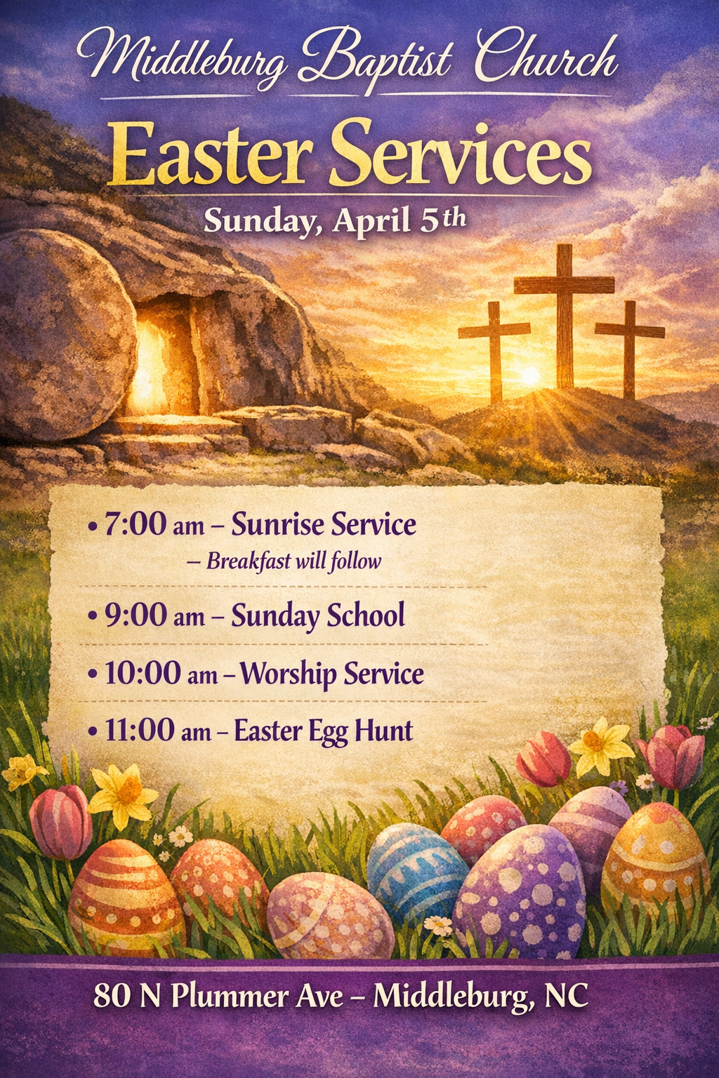 Easter service on Sunday, April 5th begins at 10am.